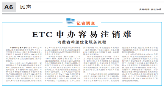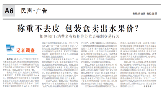 反映群眾呼聲,解決“急難愁盼”。每周四出版一期“民聲”版,主要宗旨是傾聽民聲,傳遞民意,回應訴求。主要欄目有《記者調(diào)查》《你說我說》《熱線回復》《讀者原聲》等欄目。其中,《記者調(diào)查》欄目是輿論監(jiān)督主陣地,刊發(fā)了《小區(qū)直飲水機因拖欠場地費將要撤離?》《ETC申辦容易注銷難》《稱重不去皮 包裝盒賣出水果價?》等大量輿論監(jiān)督稿件,助力民生問題解決。