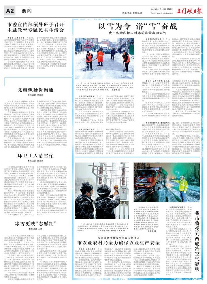 1月中旬,三門峽市迎來強降雪寒潮天氣,對群眾出行安全造成影響,《三門峽日報》1月17日A2版刊發(fā)《以雪為令 浴“雪”奮戰(zhàn)》(如圖),對各地各部門進入“以雪為令,隨下隨清,雪停路凈”的高效動員模式進行圖文報道。在防汛關(guān)鍵時期,加強與應急、氣象等部門對接,加強科普宣傳,提高廣大群眾防災避險的能力,增強其防災避險意識。