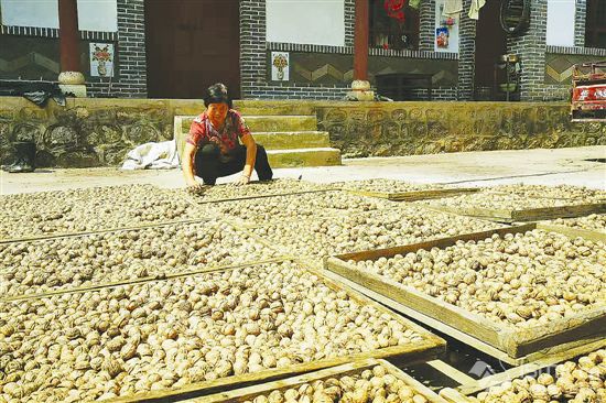 ![]() 盧氏縣是“中國(guó)核桃之鄉(xiāng)”,核桃年產(chǎn)量一直居全國(guó)縣級(jí)第四、全省第一位。近三年來(lái),盧氏縣把核桃作為脫貧攻堅(jiān)支柱產(chǎn)業(yè),新發(fā)展核桃種植面積21萬(wàn)畝,全縣核桃種植總面積100萬(wàn)畝以上。“白露到,收核桃。”今年是核桃豐收年,全縣山鄉(xiāng)農(nóng)村到處都是晾曬核桃的場(chǎng)景。圖為近日官坡鎮(zhèn)沙溝村貧困戶張金平在晾曬核桃。張海軍 攝