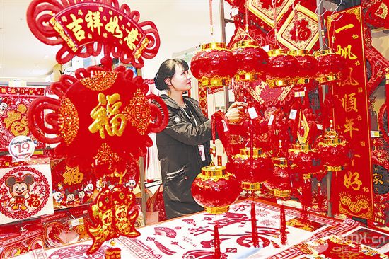 新春佳節(jié)臨近,我市一些商場(chǎng)掛滿了春節(jié)飾品。市民紛紛走進(jìn)商場(chǎng),挑選燈籠、窗花、貼畫等飾品,喜迎農(nóng)歷新年。