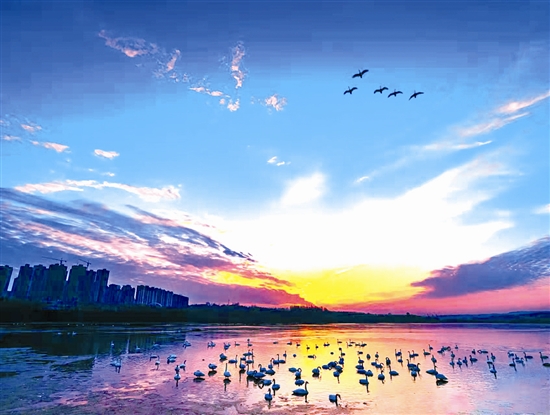 12月27日傍晚,晚霞映紅了209國道旁的天鵝湖。白天鵝或在結冰的湖面上悠閑散步、嬉戲打鬧,或凌空翱翔,與滿天霞光交相輝映,構成一幅靜謐的“天鵝湖冬景圖”。 麻新利 攝