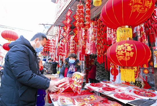 臨近春節(jié),市區(qū)各大商場、超市、集貿(mào)市場年味漸濃,從春聯(lián)福字到燈籠掛飾,從米面油到瓜果蔬,各類商品一應(yīng)俱全。圖為1月25日,在市區(qū)宏遠(yuǎn)市場,人們忙著選購年貨,迎接虎年新春佳節(jié)的到來。 本報(bào)記者 張朝峰 攝 |