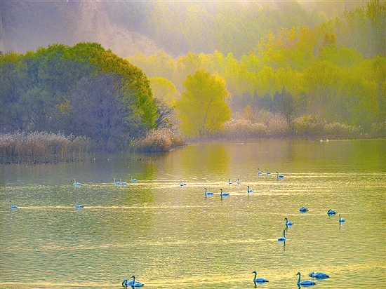 ![]() 11月19日清晨,在天鵝湖國家城市濕地公園內,陽光透過薄霧傾瀉而下,金黃的樹葉倒映湖面,暢游的白天鵝悠然自得,猶如油畫一般,令人如癡如醉。 本報記者 杜杰 顧新風 攝 |