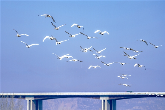 ![]() 近日,靈寶市境內(nèi)運(yùn)寶黃河大橋附近濕地有1000多只白天鵝覓食越冬,成群的白天鵝自由飛翔,與黃河大橋、風(fēng)車相映成趣,呈現(xiàn)出一幅冬季美麗畫卷。 本報(bào)記者 杜杰 攝 |