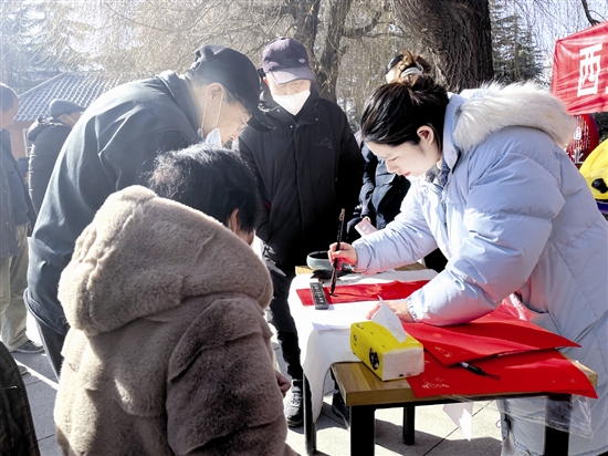 ![]() 1月6日至8日,三門峽市民、西安美術(shù)學院書法系研究生任杰自費購買紙墨,在三門峽經(jīng)濟開發(fā)區(qū)黃河廣場為市民現(xiàn)場書寫贈送春聯(lián)。一些圍觀的書法愛好者也加入其中,揮毫潑墨,交流經(jīng)驗。他們3天時間書寫贈送各體春聯(lián)280副,為市民送上新春的祝福。 本報記者 張茜 攝 |