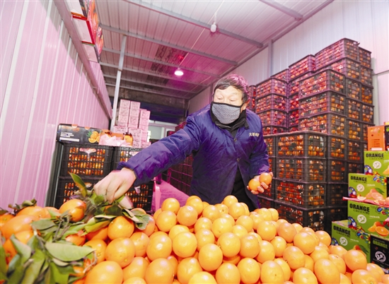 春節(jié)將至,我市全力做好“菜籃子”保供穩(wěn)價(jià)工作,市場(chǎng)供應(yīng)充足,價(jià)格穩(wěn)定。圖為1月16日,在市區(qū)澗南蔬菜批發(fā)市場(chǎng)一家水果批發(fā)門店,大批剛從南方運(yùn)來的新鮮橙子到貨,供市民選購。 本報(bào)記者 張朝峰 攝 |