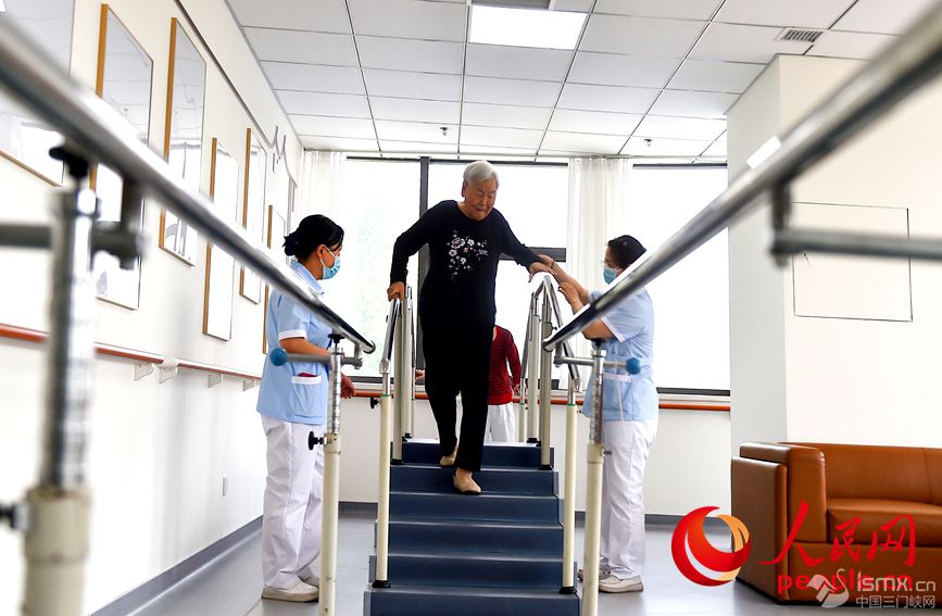 河南科技大學(xué)第七附屬醫(yī)院老年護(hù)理中心,醫(yī)護(hù)人員協(xié)助指導(dǎo)患者開(kāi)展康復(fù)鍛煉。人民網(wǎng)記者 尚明楨攝