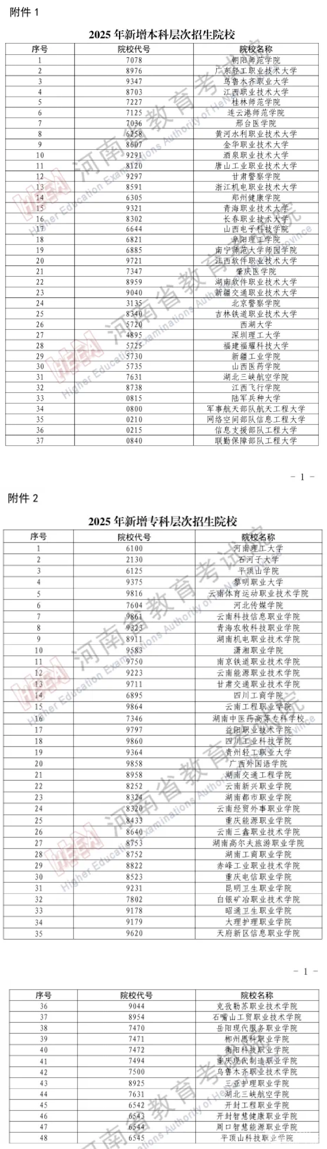 今年在豫招生的高校 新增本科層次院校37所 專科層次院校48所 據(jù)河南招生考試信息網(wǎng)消息,我省2025年普通高校在豫招生新增部分本?圃盒,主要包括新設(shè)院校、升格更名院校以及原有院校但在河南首次招生等。其中,新增本科層次院校37所(見附件1),?茖哟卧盒48所(見附件2)。 省教育考試院提醒廣大考生,新增本?圃盒U猩媱澋刃畔⒖赏ㄟ^《招生考試之友》(專業(yè)目錄)查詢了解,正式填報志愿請以《招生考試之友》(專業(yè)目錄)公布的招生院校、院校專業(yè)組、專業(yè)名稱、專業(yè)代號和選考科目要求為準(zhǔn)。 ( 編輯:ycl ) |