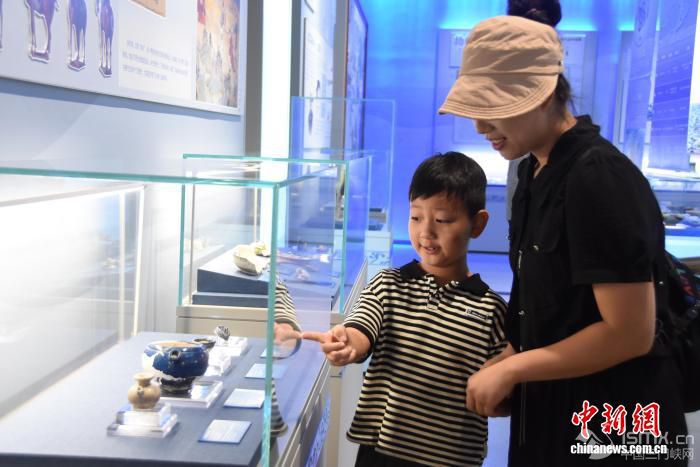 ![]() 8月13日,在位于河南鄭州的河南南水北調(diào)博物館內(nèi),國內(nèi)首次唐代青花瓷專題展“絲路華章——唐代青花瓷瑰寶展”吸引眾多游客參觀。圖為家長帶孩子參觀唐代青花瓷。 王宇 攝