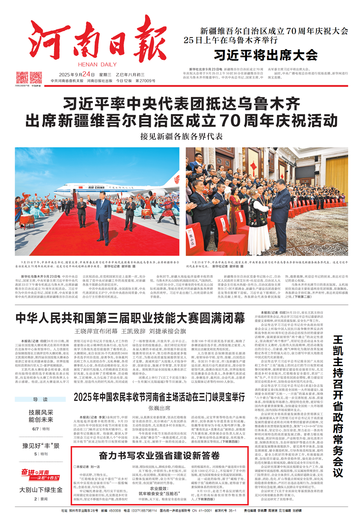 河南正扛穩(wěn)使命勇奮進 牢記殷殷囑托 錨定農(nóng)業(yè)強省目標推進鄉(xiāng)村振興 農(nóng)業(yè)提效筑根基 糧食安全有保障 產(chǎn)量連續(xù) 8 年超 1300 億斤 高標準農(nóng)田達 8808 萬畝 約占全省耕地總面積的78% 藏糧于地、藏糧于技深入實施 走進蘭考縣儀封鎮(zhèn)代莊村,連片的高標準農(nóng)田里作物長勢喜人,種糧大戶牛煜會正拿著手機查看田間墑情監(jiān)測數(shù)據(jù),“這2000畝地全部實現(xiàn)了高標準改造,每50畝配套一眼機井,還安裝了智能滴灌和物聯(lián)網(wǎng)墑情儀,動動手指就能澆地。” 19.6 萬家合作社 27.5 萬家家庭農(nóng)場激活效能 滑縣煥永種植農(nóng)民專業(yè)合作社“全程機械化+綜合農(nóng)事服務(wù)”模式覆蓋周邊10余個鄉(xiāng)鎮(zhèn),年機械化服務(wù)面積5萬畝次。合作社理事長杜煥永自豪地說:“我們提供耕種管收全流程服務(wù),既降低了成本,又通過科學管理提高了糧食產(chǎn)量。” 耕種收機械化率居全國前列 從 “糧倉” 到 “油庫”“肉庫” 供給從 “吃飽” 向 “吃好” 升級 農(nóng)村提質(zhì)美家園 宜居宜業(yè)暖人心 光山縣文殊鄉(xiāng)東岳村,曾經(jīng)“土坯房連片、晴天一身土、雨天一身泥”的景象早已不見,如今村內(nèi)道路全部硬化,路燈照亮每條街巷。村民崔紅梅感慨道:“現(xiàn)在出門能坐公交,在家能連5G網(wǎng)絡(luò),跟城里生活沒啥兩樣。” 基礎(chǔ)設(shè)施完善 既便利村民生活 更帶動鄉(xiāng)村產(chǎn)業(yè) 東岳村鴨蛋、大米等經(jīng)電商進城 稻田小火車、花鼓戲展演年引上萬游客 如今,東岳村旅游產(chǎn)業(yè)年收入達1300萬元 長葛崗李村的美靠村民自覺 學村規(guī)、推文明積分制 守硬件育新風 正是河南學用 “千萬工程” 建和美鄉(xiāng)村的縮影 農(nóng)民增收強底氣 變身振興 “主人翁” 走進西峽縣桑坪鎮(zhèn)三灣村,余澤基的香菇大棚里整齊排列的菌棒上,一朵朵香菇長勢喜人。“以前種地靠天吃飯,一年忙到頭也剩不下幾個錢。”余澤基說,“后來村里推廣香菇種植,合作社提供菌棒、技術(shù),我試著建大棚,沒想到效益這么好。種香菇讓我們一家走上了致富路。”如今,他已成為當?shù)氐姆N植能手,每年凈收入超過9萬元。 西峽縣的香菇產(chǎn)業(yè) 正是河南推動“一縣一業(yè)”“一村一品”的縮影 “龍頭 + 合作社 + 農(nóng)戶” 拓富路 2024 年農(nóng)村居民人均可支配收入達 21330 元 城鄉(xiāng)差距縮小 技能培訓(xùn)提升“發(fā)展力” 全年培訓(xùn) 35.5 萬農(nóng)民 實現(xiàn)從 “靠體力” 到 “憑技能” 的轉(zhuǎn)變 征程萬里風正勁 重任千鈞再出發(fā) 河南正繪就 “三農(nóng)” 新圖景!