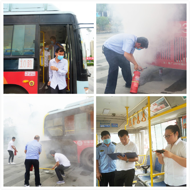 公交車動態(tài)安全演練模擬一輛正在行駛中的公交車,駕駛員突然聞到車內(nèi)有異味,發(fā)現(xiàn)車輛尾部發(fā)動機(jī)艙在冒煙,駕駛員隨即打開緊急雙閃燈,啟動車內(nèi)智能監(jiān)控報警,向公司智能調(diào)度中心報警,并立即靠邊停車,打開前后車門,疏導(dǎo)乘客從前后門有序下車,遠(yuǎn)離車輛。駕駛員在檢查車內(nèi)無乘客后,下車查看火情,用車上滅火器對準(zhǔn)著火點(diǎn)底部滅火,同時撥打火警電話。搶險救援組得知后緊急奔赴現(xiàn)場,開展事故應(yīng)急救援,事故處理組帶領(lǐng)人員現(xiàn)場調(diào)查和搜集材料,向公司上報相關(guān)情況。