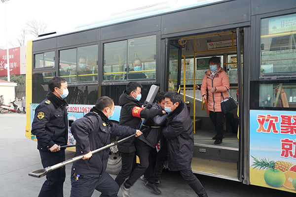 在火車站首末站,恰逢一車隊(duì)工作人員正在開展疫情防控應(yīng)急演練,一未佩戴口罩的乘客欲乘車,駕駛員制止后,該乘客非但不聽,強(qiáng)行上車后辱罵、持刀相向駕駛員,駕駛員隨即將情況報(bào)告車隊(duì)長并報(bào)警,車隊(duì)安保人員將其制服??赐暄菥毢?,熊衛(wèi)軍、錢萬輝對工作人員面對突發(fā)事件的應(yīng)急處置能力點(diǎn)贊。