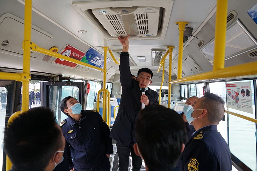 公交車靜態(tài)安全演練主要考察駕駛員對公交車內(nèi)安全錘、滅火器和手動開門按鈕在公交車內(nèi)放置的位置、緊急逃生路線圖是否明白清楚,如何檢查燃氣管道漏氣和切斷燃氣總閥等。